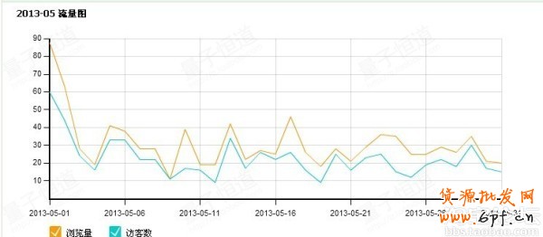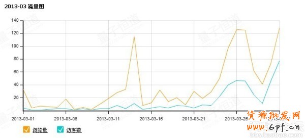 大家請看2013-03流量圖,我的店是2月28號注冊的店,后面然后上傳了一款寶貝,只是一款,大家注意到流量了沒,大約是在100左右,而且是很高的位置,當然出現峰值的時候是7天的一個上下架時間,那個時候流量最高。