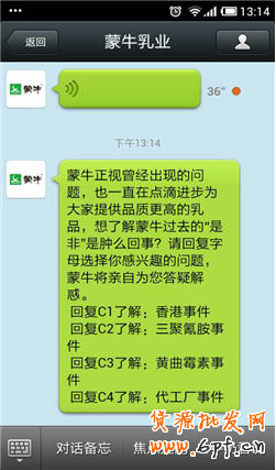 在社會(huì)化媒體端,蒙牛也試圖以全新的形象示人。蒙牛的微信公眾賬號于5月上線,其微信賬號雖然名字為“蒙牛乳業(yè)”,但從內(nèi)容來看,其實(shí)它的定位是微信客服,主要意義在于與消費(fèi)者溝通,回答消費(fèi)者的一些疑問。