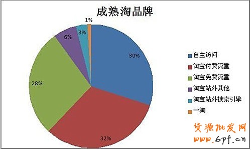 成熟的淘品牌商自主訪問流量及付費流量占比平均化。對成熟的淘品牌商家而言,其品牌已經有了一定的知名度,例如裂帛服飾旗艦店、阿芙四季堂專賣店、韓都衣舍等,它們的自主訪問、免費流量以及付費流量占比基本相同,其流量結構大概如下表所示: