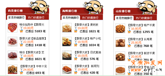 二是熱賣關聯:像淘寶淘金幣后臺頁面左側有兌現TOP10的寶貝,直接把淘寶幣中最受買家親瞇的前十位寶貝展示出來,我們店鋪中也可以這樣來做,下圖是我們一位零食賣家的店鋪左側熱賣關聯,賣家的東西好不好,銷量是最有力的無聲言辭。