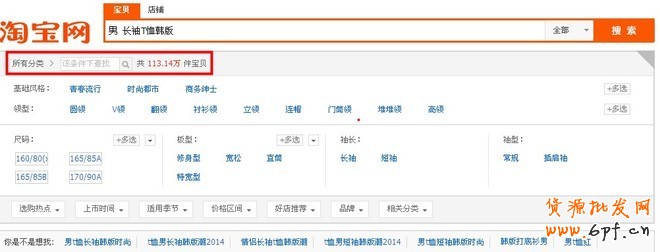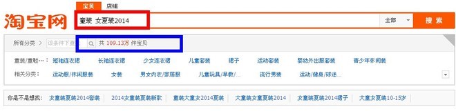 記住這兩個關鍵詞,然后我們打開淘寶網首頁如下圖,我將這兩個關鍵詞分別的在淘寶搜索頁面搜索了一下,我們要查的是什么呢?查的是輸入這兩個關鍵詞后所出現的寶貝數量!第一個關鍵詞:2014新款女童夏裝 搜索后出現了 85.07萬的寶貝,而第二個關鍵詞:童裝 女夏裝2014 搜索后出現了109萬個寶貝,上面我們已經測試過這兩個寶貝的搜索指數,2014新款女童夏裝 要比后者的搜索指數要高出5000點,但競爭的寶貝數量卻比后者少出將近20多萬個寶貝數量,顯然2014新款女童夏裝 這個關鍵詞的性價比是最高的,那我們就把這個詞當作前綴關鍵詞留著吧!