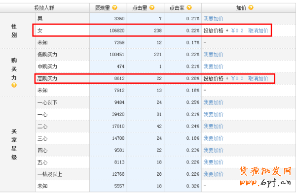 1.分析寶貝對象的性別,對主要購買人群進行加價。通投位置出價可以比較低,加大對性別的出價。