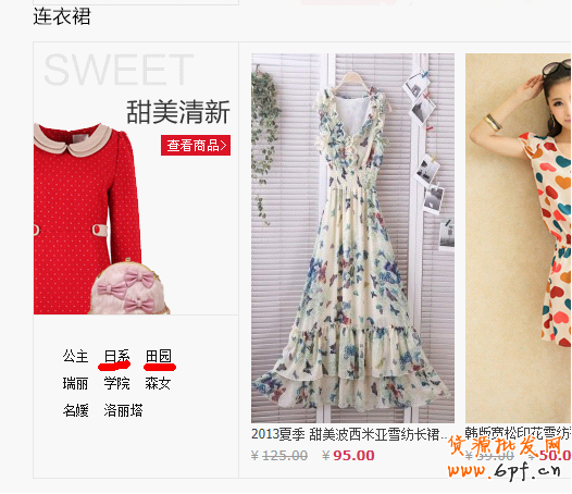 之后我們再看看哪些關鍵字是在你第一次下架之前,絕對必須要出現在你的標題里面的,如果我們查看類目的推薦,試著點擊 日系,你會發現,進入的寶貝展示頁面,會出現淘寶預設的 關鍵字 日系甜美連衣裙。