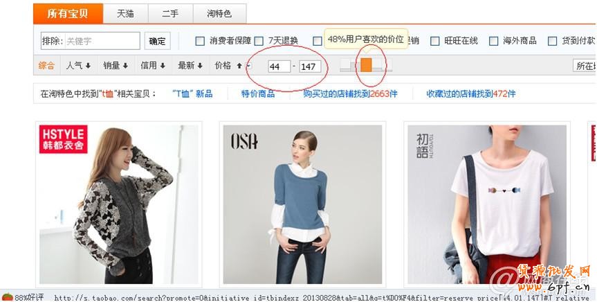 通過熱詞:t恤,根據第一順位48%用戶喜歡的價位(44-147元),這個價格就是促銷價,不是市場價格,搜索到有12862417件寶貝,按照7天展示1次。