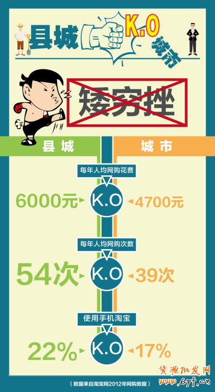 新出爐的淘寶2012全國縣域地區網絡消費調查顯示,在其調查的全國2006個縣域地區中,2012年共有超過3000萬的人上淘寶購物,去年僅淘寶購物就花費1790億元。去年縣城與大城市的網購數據比例是:人均年花費6000塊VS4700塊,人均網購次數54VS39,使用手機淘寶比例22%VS17%。這些數據統統說明了:網購迎來了“縣城時代”。