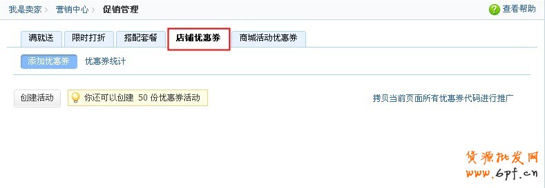 設置成功后,商家們會看到這樣的后臺,在每一份優惠券右下角,有“拷貝此優惠券代碼進行推廣”的入口,商家朋友們可以拷貝代碼講優惠券放到店鋪中醒目位置供買家點擊領取