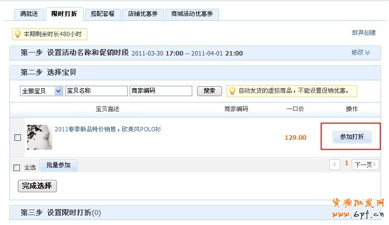 4.1每期限時折扣共480小時,限50次,30天為一期。每次活動時間不能少于1個小時。每個活動最多包含20個商品。