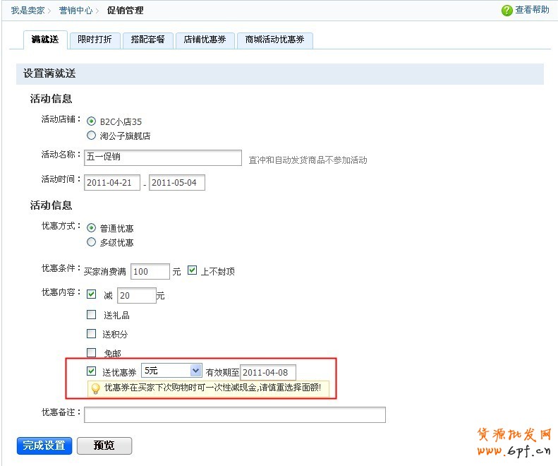 如果您有開通官方網店,那么會在活動店鋪選擇中看到兩個店鋪,一個為淘寶商城店鋪,一個為官方網店。兩者在設置上的唯一區別是,若選擇官方網店,則“優惠內容”中不會出現“送積分”選項,積分是商城獨有的?;顒釉O置一旦完成,不能對活動店鋪進行修改。