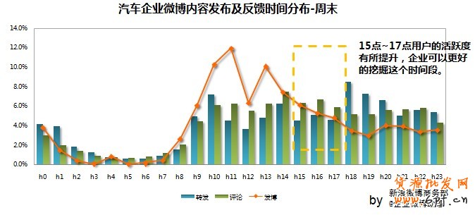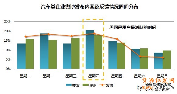 周四用戶反映熱烈:汽車企業微博在周四的反饋效果顯著高于每周其他時間段。