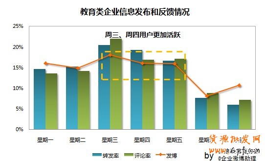 周一到周三用戶不夠活躍:建議企業在周四進行更多的營銷活動,將前半周的發博量轉移一部分到后半周