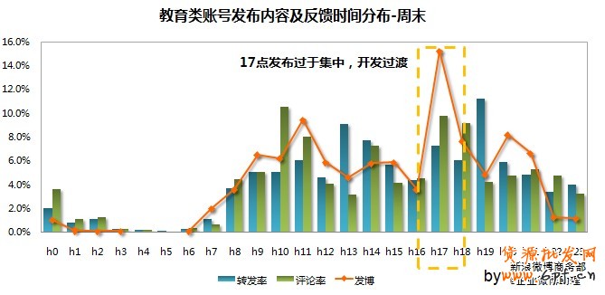 17點~23點用戶互動強烈:17點之后教育類微博的受眾放學或下班,有比較強烈的互動欲望。但企業卻較少發布內容,這段時間需重點利用。