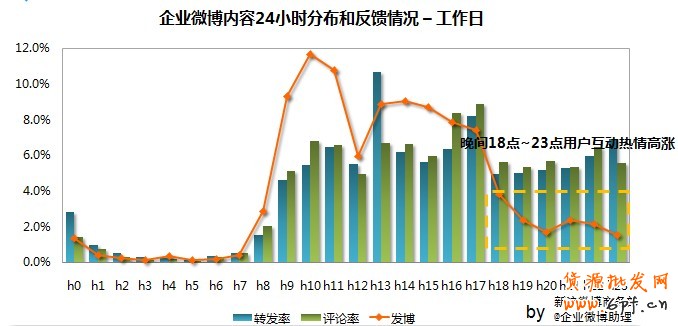 晚間18點~23點用戶互動的熱情高漲:但企業微博發布的內容量急劇減少。18點~23點是企業可開發的時間段