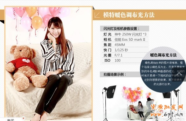 3盞300瓦帶柔光箱的閃光燈。在這樣的場景下,就將白平衡的設置調整為日光模式或晴天模式,拍出來的顏色色彩就與實物非常接近了。因為閃光燈輸出是有固定色溫的,如果你將相機的白平衡模式在這時調至其他模式便會出現色彩上的偏差。(色溫的定義:指的是光波在不同的能量下,人類眼睛所感受的顏色變化。 可見光領域的色溫變化,由低色溫至高色溫是由橙紅 –> 白 –> 藍。)