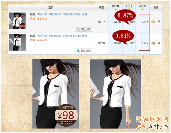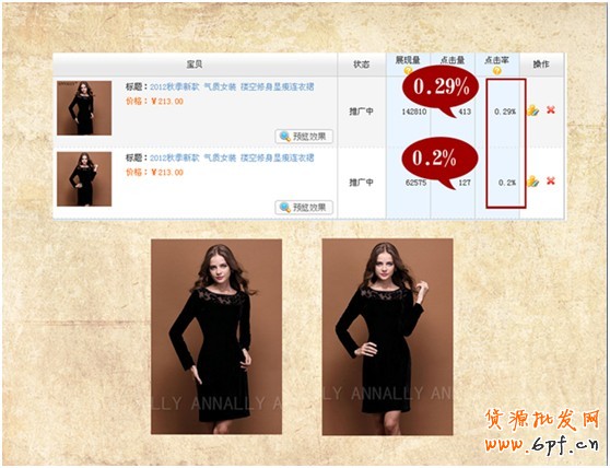 挑選出點擊率最高的模特圖及對應底圖之后,下一步就可以考慮圖片的重心問題。如下圖這款連衣裙考慮在直通車的位置顯示的是210*210的大小,這個規格偏小,使得圖片如果視角過大會造成不清晰,把產品拉大之后就可以更加看到客戶想要的,從而增加爆光率。下圖中的左圖是原圖,右圖是放大圖,放大后圖片點擊率增加了0.13%。
