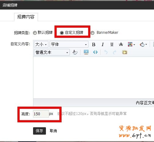 第八步:鏈接全部弄好之后,回到后臺,打開店鋪裝修,然后編輯店招,選擇自定義招牌,下邊的高度設置150PX,如下圖。