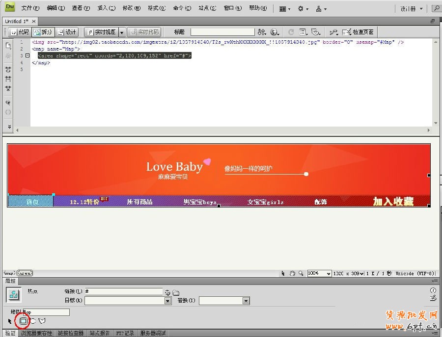第六步:找到軟件最下邊,屬性欄里的一個長方形圖標,然后在圖片上按住鼠標不放慢慢拉動,就會出現一個半透明的東西,這個叫做熱點。如下圖。