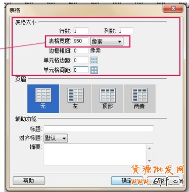 第二步,在下面彈出的框里設(shè)置表格的寬度為950像素。如果您要在左側(cè)做公告欄的話,那么這里的寬度就要設(shè)置190像素。