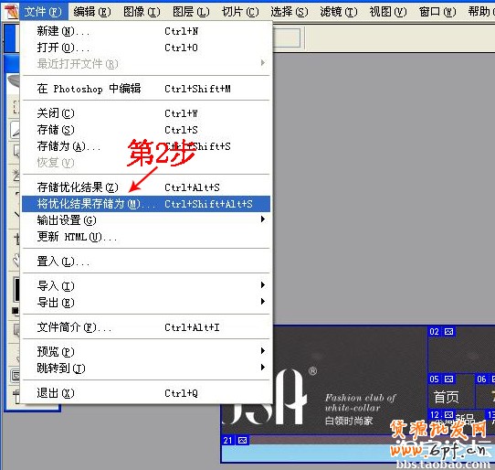 在ImageReady打開切片的背景圖片后,點擊”文件->-“將優(yōu)化結(jié)果存儲為(m)。