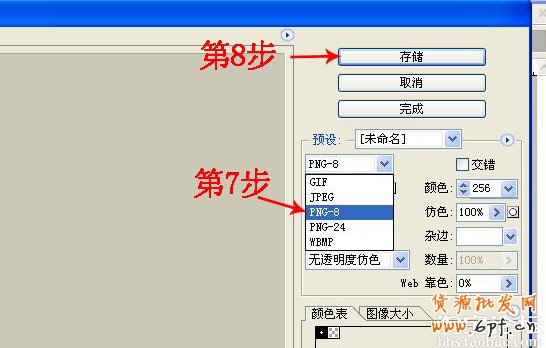 在彈出的對話框中, 圖片格式必須設(shè)置為“PNG-8”,按存儲。