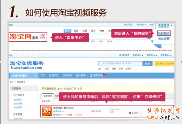 (1)首先,點擊淘寶首頁頭部的“賣家中心”選項,在打開的“賣家中心”右上角“賣家服務”“我的服務”,然后選擇“淘寶視頻”的標識,點擊即可進入上傳視頻的頁面了(見下圖)。