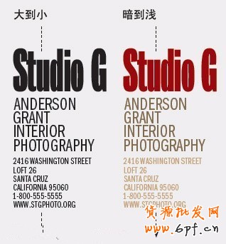 精心設計的文字包含了四個視覺引導。從位置來說,呈現由上至下的引導;從字體尺寸來說,是由大至小的引導;從字體樣式來說,是由粗至細的引導;從顏色明暗來說,是由暗到亮的引導。這種特點在這個設計中發揮重要的作用,你的眼睛很自然的由一個元素去到下一個元素,毫無阻礙。