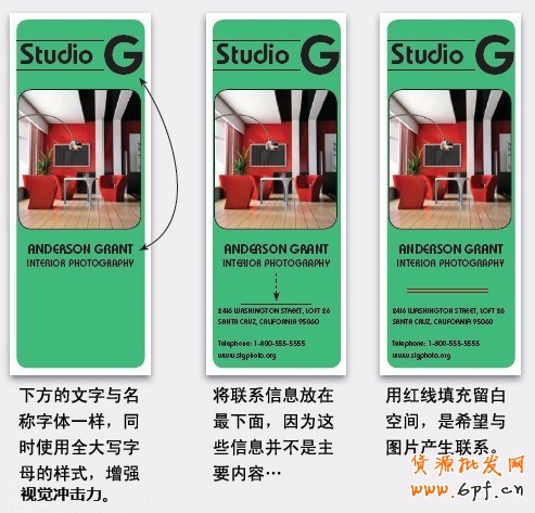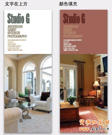 無論上下左右,怎么放都讓人滿意。因為圖片及元素都自成一體,互不干擾,文字放在上面, 效果與放在下面一樣出色。水平放置,同樣顯得優雅精美。其實這是顏色的功勞,不同的圖片要用不同的顏色,文字顏色取自于圖片中,這樣文字與圖片既分離,但又有聯系,整體總是顯得和諧一致。當然,還要記住視覺引導:名稱要重點強調,而其它的字體則低調處理。