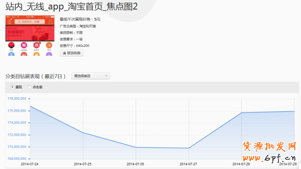 【資源位信息】資源位的尺寸、大小、類目限制、創(chuàng)意條件,展位的日均展現(xiàn)量,點(diǎn)擊率,是操作專員與美工在調(diào)整展位時(shí)必須提前了解。在挑選展位時(shí),要注意廣告主類型,有部分展位是只針對(duì)C店的,有部分是只針對(duì)B店的。
