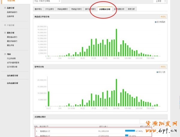 從這張圖片我們可以看到女裝類目在上一季度的買家分析數(shù)據(jù),該類目下一次購買占比67%,2次購買占比20%左右。