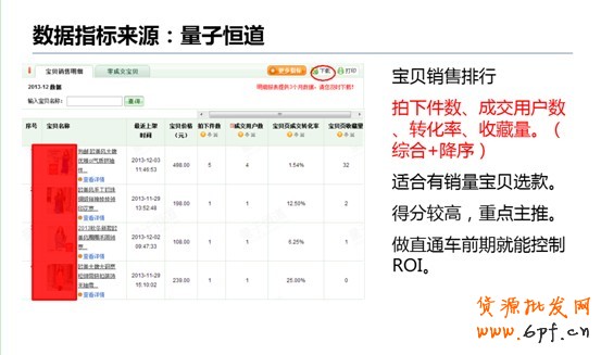 對于有一定銷量的寶貝,我們同樣可以利用量子恒道獲取數據指標,但與零銷量寶貝的選取功能維度不同,我們要在“寶貝銷售排行”這項功能中,獲取對應的數據。建議選取的數據維度:拍下件數、成交用戶數、轉化率和收藏量。