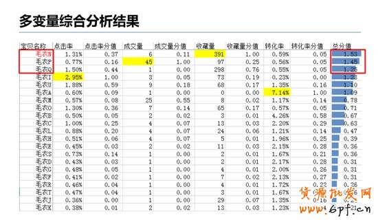 基于此理,我們也可以計算出店鋪寶貝毛衣A的綜合得分。但是否將毛衣A的點擊率、成交量、收藏量和轉化率相加即可得出呢?如果你將這四個維度的數值進行相加,只會得到一個錯誤的結果,因為每個維度的數值單位不同,是不能相加的。所以我們必須找到一個科學的計算方法,這就是下面將要講到的“多變量綜合評價法”。