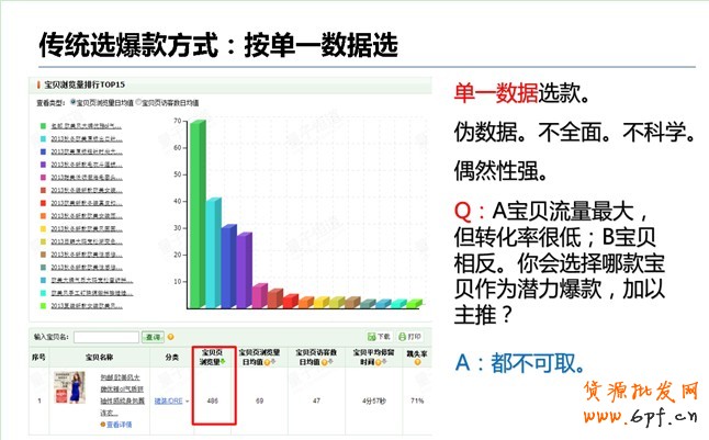 第二種是按單一維度選款。這種選款方式也有很多淘寶掌柜使用。這種選款方式有一定的數據作為參考,但因為只看某一個維度的數據,如轉化率、如流量等,會有很大的片面性和偶然性,同樣會選款不準。