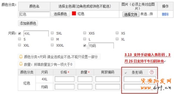 1. 2014.3.13,編輯寶貝時、新發(fā)寶貝時添加條形碼填寫字段,需手動輸入商品條形碼,無條形碼商品填寫13個0代替;