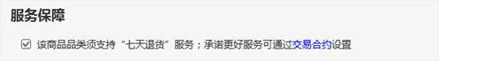必須支持"七天退貨"服務的商品,默認出現以下提示且不能修改(如服裝服飾、數碼產品及配件、家紡居家日用、化妝品、嬰童用品等)