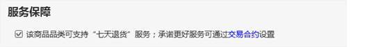 一、 對于根據商品性質不支持"七天退貨"服務的商品,前臺不再展示七天退貨的標簽。如果賣家表示能支持退貨服務的,需要通過退貨承諾這一交易合約設置8天(含)以上的服務。