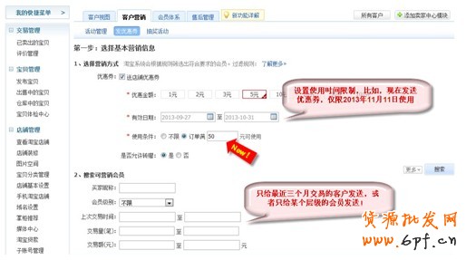 據(jù)記者了解,為了迎接即將到來的下半年銷售旺季,會員關(guān)系管理和營銷工具店鋪優(yōu)惠券將實行打通,并提供賣家使用限額優(yōu)惠券的功能,只要賣家同時開通了“會員關(guān)系管理”和“店鋪優(yōu)惠券”的功能,則可以向會員發(fā)送有使用限制的店鋪優(yōu)惠券。