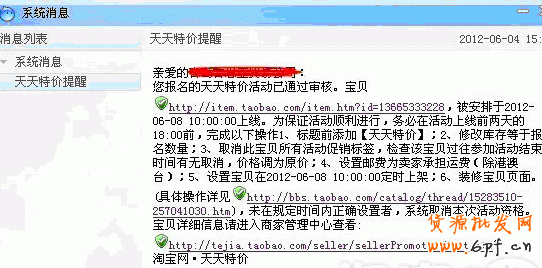 報名天天特價的商品的商家,必須在收到旺旺系統通知后,做好定時上架工作。先將活動寶貝下架,再設置系統通知的活動當天時間準時上架。若在預告期間寶貝恢復上架,請手動下架,活動開始時,系統會自動上架寶貝。
