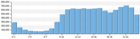 從交易數(shù)據(jù)曲線圖上,我們同樣可以看出,周末2天的流量與周一到周五的差距還是較大的。為了讓產(chǎn)品能夠盡量獲得較大的流量,建議主要集中在周一到周五,周六周日2天合并為一天對待。經(jīng)過分析可以獲得了兩個數(shù)據(jù)指標(biāo):將一周按6天等分,1天內(nèi)訪客較大的時間有9小時。