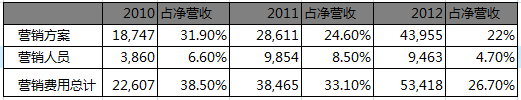 2010、2011、2012年,蘭亭集勢的營銷費用分別為2260萬、3846萬、5341萬美元;其中主要花費是在營銷方案上,同期占凈營收的比重分別為31.9%、24.6%、22%;營銷人員上的開支占比不超過10%,2012年下降至4.7%。