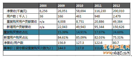 蘭亭集勢招股書并未披露其重復購買率和訂單量這些數據,只提供了用戶總數、重復購買用戶貢獻營收、新增用戶購買營收這些數據,通過這些數據可知,重復購買營收占總營收的比重在逐漸上升,2010、2011、2012年分別為14.91%、17.97%、24.69%,但整體來看,重復購買占比仍比較低。其次,我們保守的假設重復購買的用戶一年只消費兩次,可以大致推斷出蘭亭集勢的客單價,2010、2011、2012年分別約為117.8美元、111.6美元、70.7美元,客單價明顯下降。