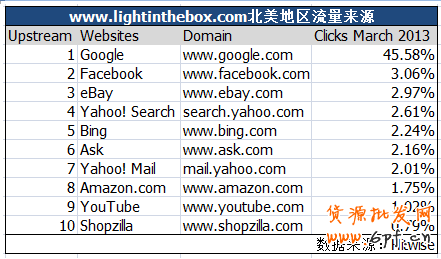 以美國的電商網站整體情況為例,來自搜索引擎的流量高達40%,當中又有大約一半來自SEO,即自然搜索,另一半則是付費營銷帶來的流量。同樣,搜索引擎是蘭亭集勢的第一大流量入口,據Hitwise數據統計,2013年3月,www.linghtinthebox.com北美地區的訪問當中,有超過45%的流量來自谷歌,其次是社交網站Facebook約為其帶去了3%的流量,其他包括eBay、Yahoo!Search、Bing、Ask、Yahoo!Mail、亞馬遜等網站為其帶去2%左右的流量。