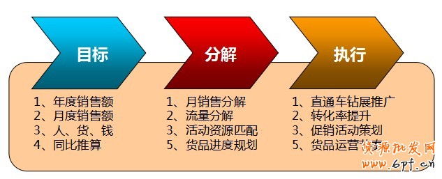 銷售計劃制定以后,需要將任務分解到電商各部門每個人員,每周查看工作進度,后端匹配供應鏈,備貨,前端銷售運營,不斷的優(yōu)化轉(zhuǎn)化率體系,有節(jié)奏的做促銷活動和參加聚劃算等大型活動,優(yōu)化好直通車與鉆石展位等重要付費推廣工具,打通寶貝新品,熱賣,活動,清倉銷售環(huán)節(jié)。