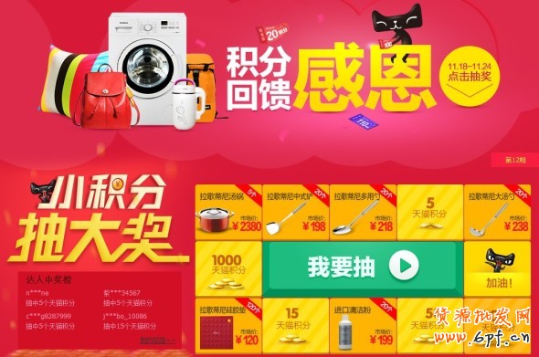 2) 小積分抽大獎是天貓達人專屬的活動,只要是天貓達人且有一定的積分,都可以以天貓積分抽獎。每次抽獎需要10個積分,抽獎次數不限。中獎的獎品包括積分和實物獎品,積分包括5天貓積分、15積分、50分,100積分,1000積分,實物獎品是活動招商的實物商品
