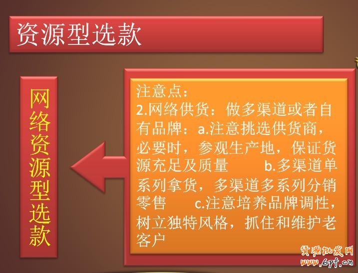 首先介紹一下第一種資源型選款,大家可以理解一下“資源”這個關鍵詞,它的意思是“現有情況下,你所擁有或者能夠接觸到的貨品或者貨品信息的渠道來源”,根據這個概念,我們就可以清晰地把資源型選款大致分為:自有資源型選款和網絡資源型選款。