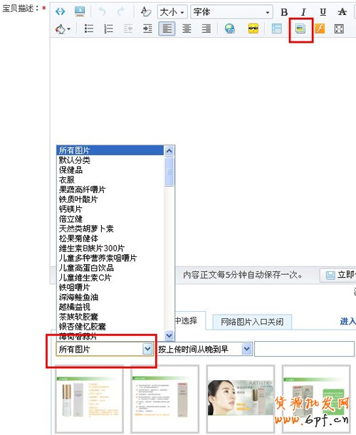 接著是寶貝描述的圖片,在寶貝描述的編輯框,選擇圖中的上傳圖片,會出現(xiàn)圖片的選項,選擇從圖片空間選擇,然后選擇之前上傳圖片的那個分類,按照順序插入就可以了~~
