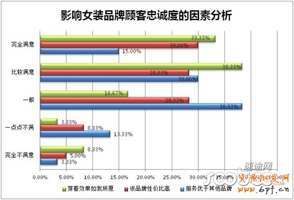 調(diào)查顯示,穿著效果是一個(gè)非常重要的內(nèi)容,一件衣服從材質(zhì)或是款式來講,是否達(dá)到客戶的內(nèi)心滿意值是很難得的,此次調(diào)查中該項(xiàng)考核合格,A級(jí)和B級(jí)占到7成之多;對(duì)于女性消費(fèi)者來說,砍價(jià)是一種樂趣也是一種需要。那么服裝的性價(jià)比自然成為頭等重要之事,女裝品牌的性價(jià)比相對(duì)來說還是達(dá)到了消費(fèi)者的價(jià)格底線,A級(jí)、B級(jí)、C級(jí)都占到了三成左右,可見品牌的性價(jià)比是影響顧客忠誠度的重要因素;購買過程中或者售后,店家的服務(wù)態(tài)度也是一道衡量標(biāo)準(zhǔn),此次調(diào)查結(jié)果顯示,店家服務(wù)居于C級(jí)水平。心想,當(dāng)滿足了穿著效果,性價(jià)比又高兩項(xiàng)之后,服務(wù)就顯得不那么重要了。但是一家店鋪的服務(wù)如何,直接關(guān)系到顧客的二次購買,各大店鋪改善服務(wù)方面不容懈怠。