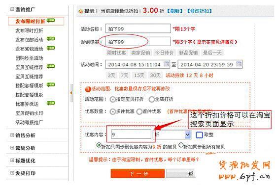 先下載相關工具,然后在設置寶貝打折的時候,在促銷標簽上填寫“拍下XX”。這樣,消費者就可以很直觀的看到拍下寶貝后的價格,具體操作可參考下圖: