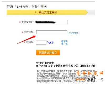 第五步,開通支付寶賬戶付款服務(wù),然后輸入支付寶賬號(hào)和密碼,點(diǎn)擊同意協(xié)議并提交申請(qǐng)。提交后就完成了開通淘寶客推廣。(這協(xié)議是為以后成交產(chǎn)品扣除傭金需要用的。)