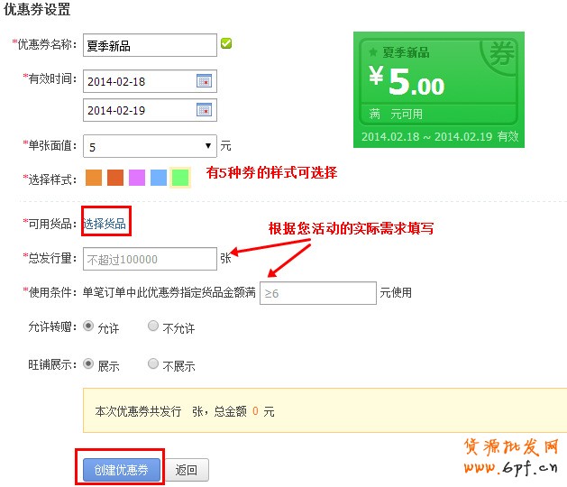 (注意:創建信息均按照您的實際需求來填寫,目前每個賣家最多能創建50張優惠劵,每張優惠券最多發行量為10萬張。創建好優惠劵,要及時“展示到旺鋪首頁”或通過代碼拷貝廣泛推廣,或將優惠券入口鏈接通知給買家,否則買家無法領取優惠券哦)