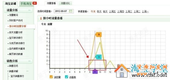 這邊就通過數據來說明,下面只是個舉例,我們可以通過量子恒道數據,看看在那個時間段,是最多訪客數的,當然這個時間段肯定是高峰期,寶貝盡可能在高峰期上架。大家可以看到在早上的9點到10點的時候,訪客是最多的,這個時間可以是高峰期,如下圖: