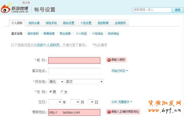 第一個(gè)地方就是修改我們的個(gè)人資料,如下圖:那么在所有的信息里面,我建議大家只需要關(guān)注昵稱和博客地址,昵稱可以是我們的店鋪名稱,然后博客地址大家可以寫成我們的淘寶店鋪地址,就相當(dāng)于我們?cè)谖⒉┥厦孀鲆粋€(gè)淘寶的店鋪鏈接,最基本的原理是只要有人去了我們微博,就有可能點(diǎn)擊進(jìn)入我們的店鋪。